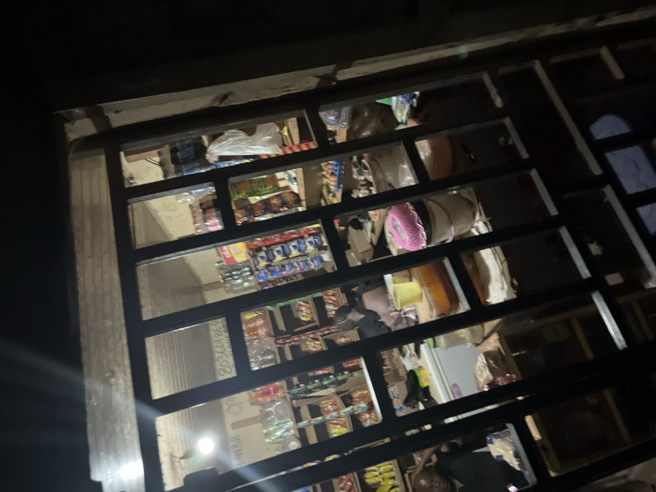 The image depicts the interior of a provision shop located in Rido, Nigeria, viewed from the exterior at night through a dark, barred window or security gate