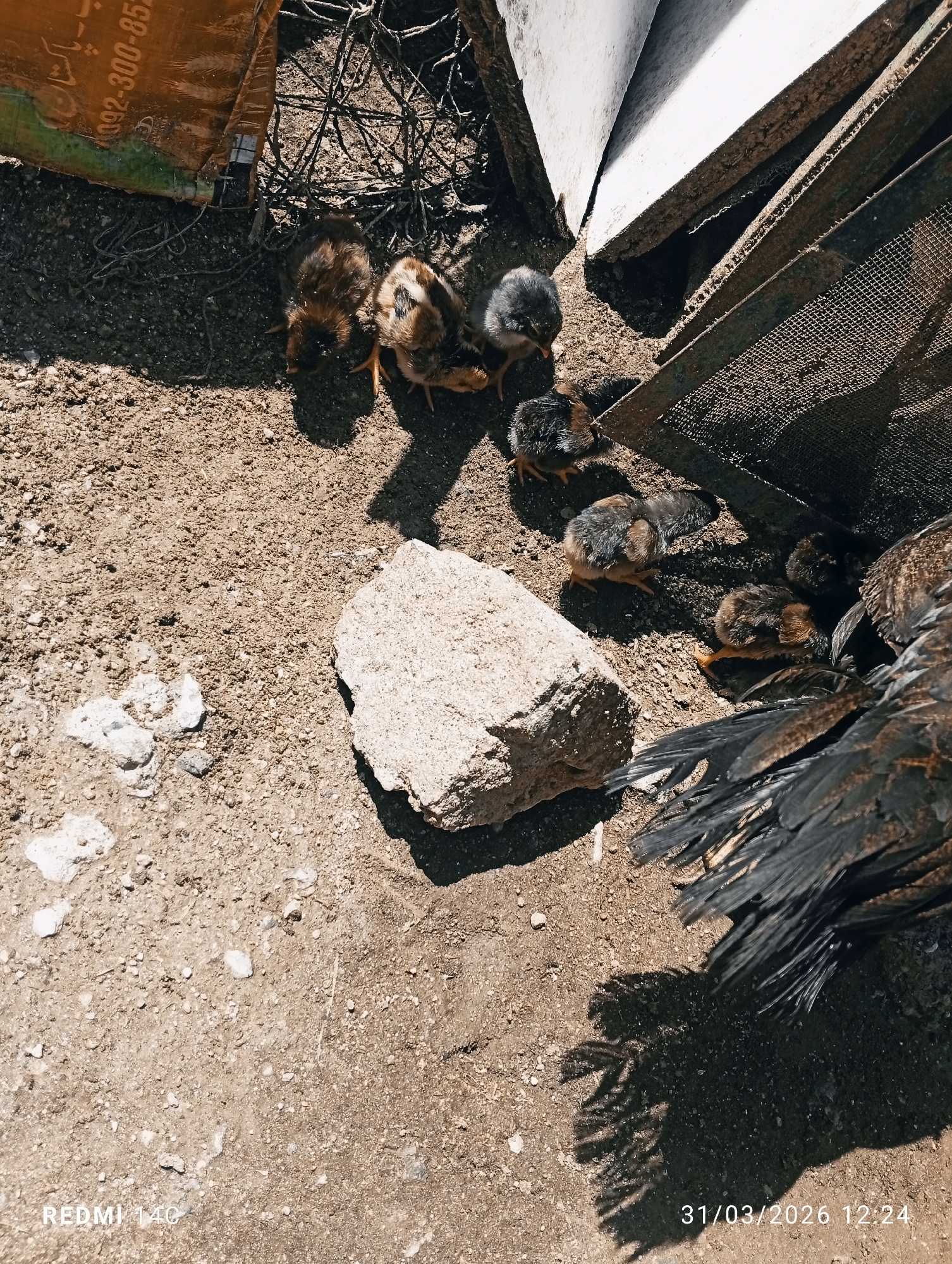 ground-level view of a dirt surface. Present are several chicks, ranging in color from brown to grey, gathered around a hen with dark feathers, near a light-colored rock. Adjacent to the birds are fragments of construction materials and a portion of a metal mesh structure. The scene is partially shaded. A piece of discarded cardboard is visible in the upper left corner. The lower left corner displays the text "REDMI 14C", and the lower right shows "31/03/2026 12:24". The setting is likely an outdoor, rural area. Location is Lassan, Pakistan.