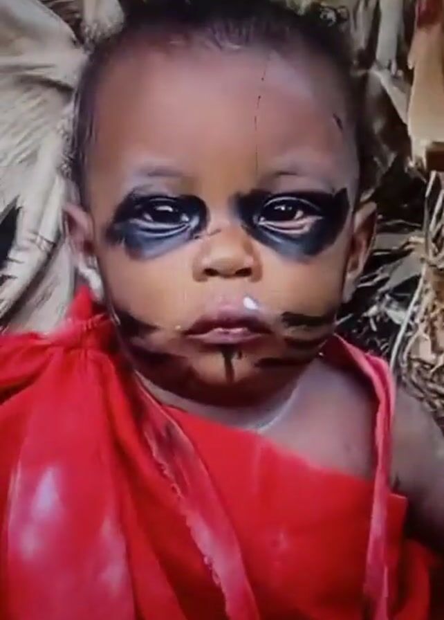 A close-up video features a baby with black face paint around its eyes and mouth, and wearing a red garment