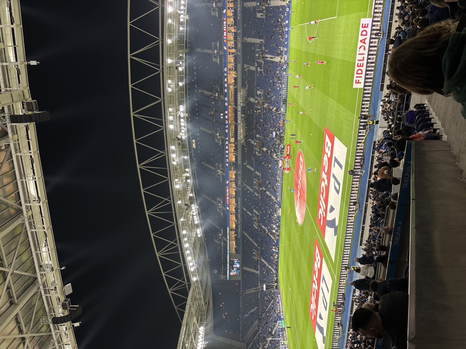 An elevated view inside a soccer stadium shows a game in progress under bright stadium lights. Crowds fill the blue seating sections around the green pitch. Prominent advertisements for "LP Betic" are visible on the field's edge. A screen displays "FUTBOL CLUBE DO PORTO" above a row of spectators. People occupy the seats nearest the photographer.