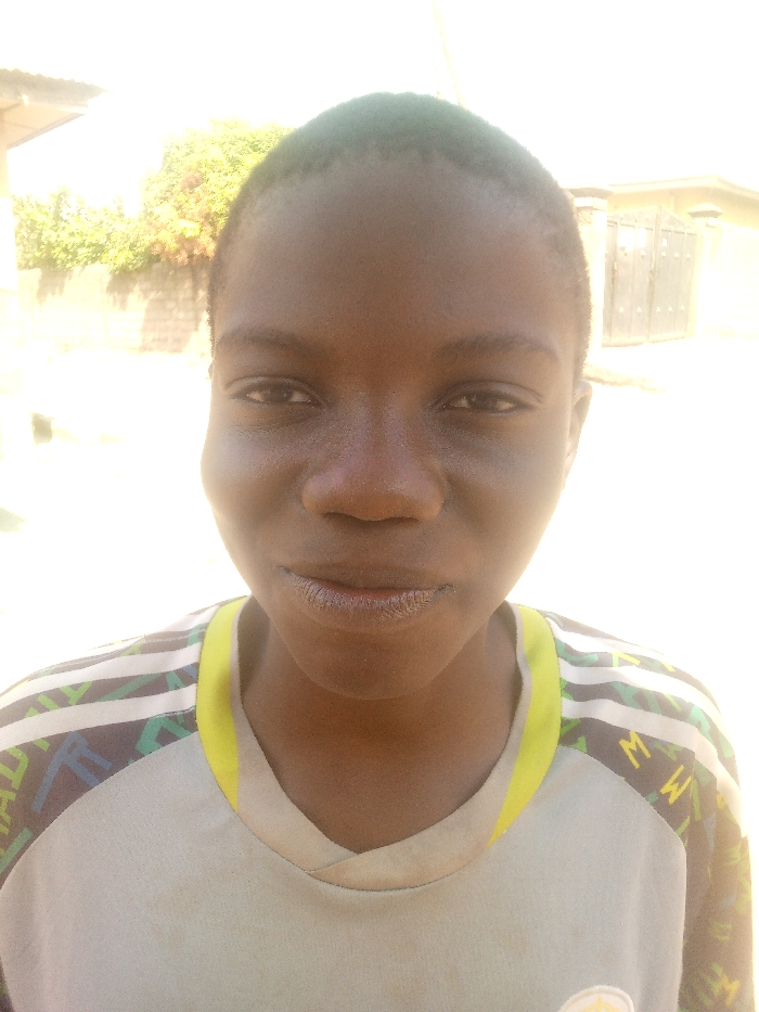 A young individual with dark skin and short, dark hair is centered in a brightly lit, eye-level portrait