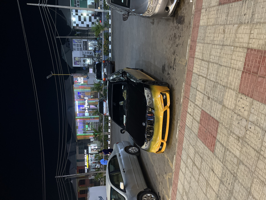 A black and yellow BMW sits angled on a street at night, with other cars parked nearby. The street has patterned brick and gray pavement. Across the street, several businesses with brightly lit signs are visible. Overhead, numerous electrical wires are strung. The lighting is dim but illuminates the scene.