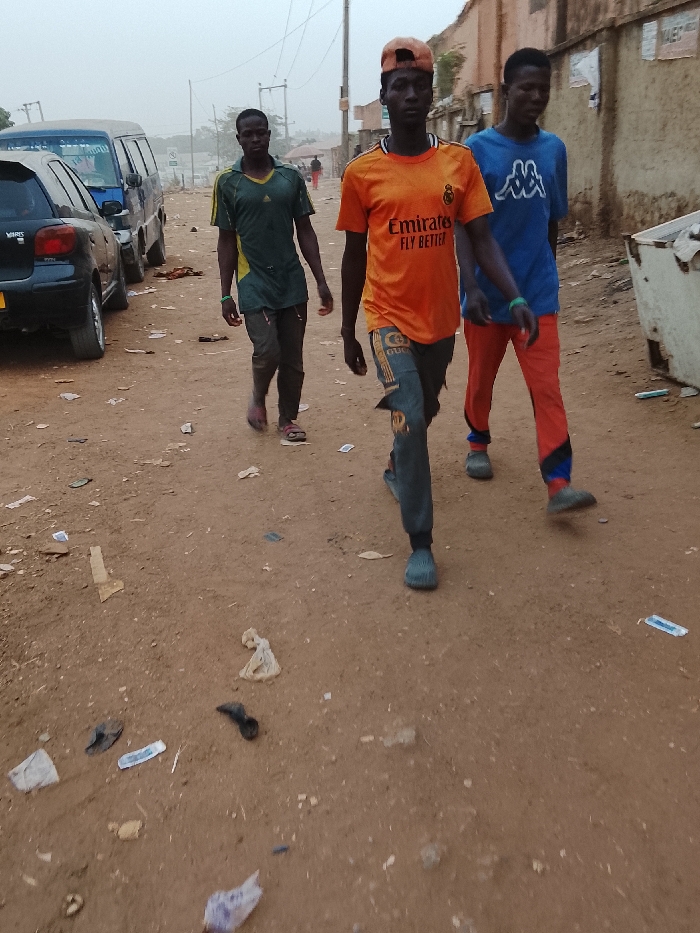 The image depicts three young adult males walking away from the camera on an unpaved, reddish-brown dirt road in Karum, Nigeria. The road surface is heavily littered with various discarded items, including plastic bags, paper, and unidentifiable debris. From left to right: 1. A male subject wearing a dark green and yellow short-sleeved shirt, dark trousers, and dark sandals. A light green wristband is visible on his left wrist. He is looking slightly to his left. 2. A male subject wearing an orange short-sleeved t-shirt with "Emirates FLY BETTER" and a Real Madrid logo. He wears an orange baseball cap backward and dark-colored pants with a patterned design. He is wearing dark athletic shoes. 3. A male subject wearing a blue short-sleeved t-shirt with a white Kappa logo, orange pants with black and blue sections, and dark athletic shoes. A light green wristband is visible on his left wrist. On the left side of the road, a black two-door sedan (consistent with a Toyota Yaris) is parked, partially obscured. Behind it, a light blue van is also parked. Further down the road, additional vehicles and indistinct figures are visible in the hazy background. On the right side of the road, a light-colored building with weathered walls is visible. A white, rectangular object, possibly a discarded appliance, rests against the building. Utility poles and overhead wires are visible against a light, hazy sky.