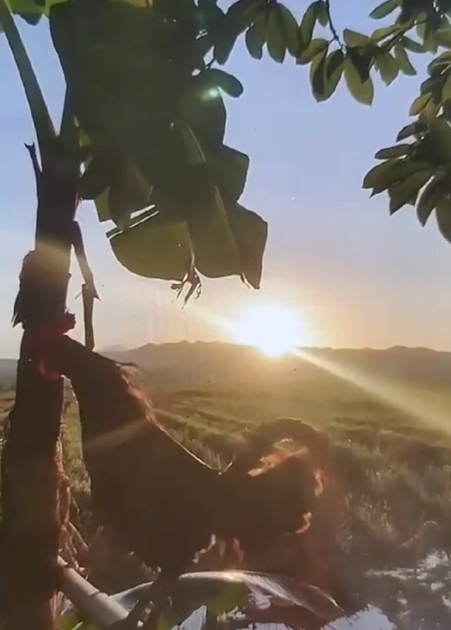 rooster perched on a branch in front of a rural landscape. The sun is rising in the background, creating a bright glow. There is lush greenery surrounding the rooster, with a mix of large leaves and smaller branches. The landscape appears to be a valley with rice paddies, and a distant hill range can be seen on the horizon. The rooster is brown and black and positioned on a makeshift wooden structure.