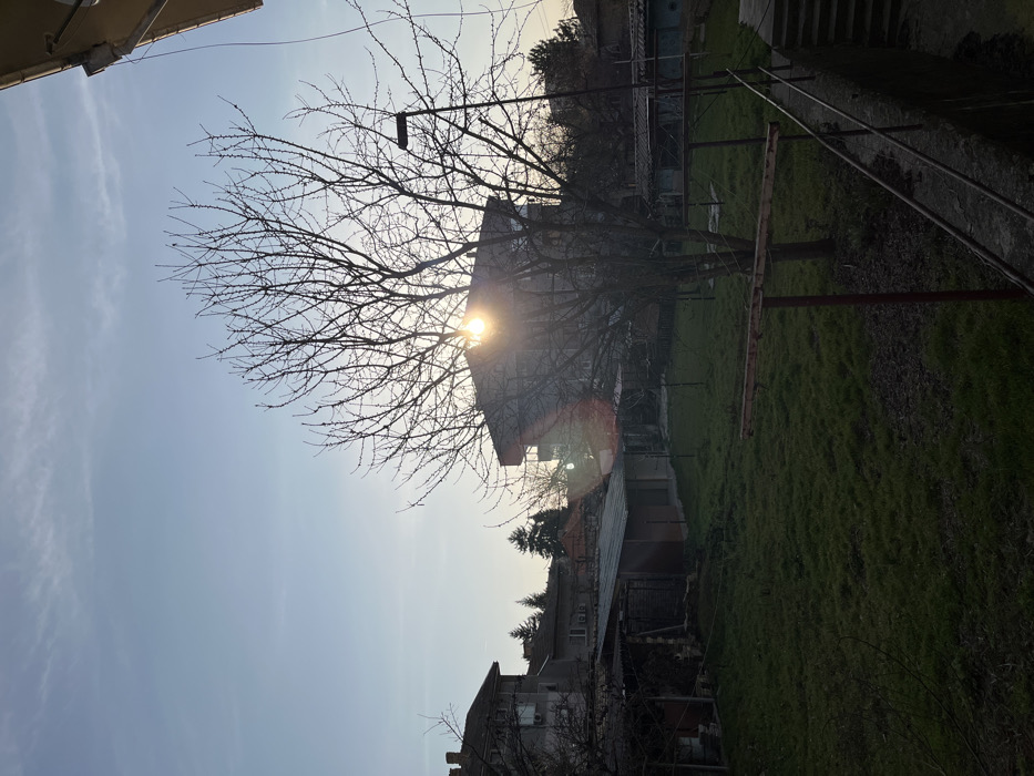 The image depicts a residential scene in Popovo, Bulgaria, under a clear, bright sky. A large, leafless deciduous tree stands prominently in the mid-ground, silhouetted against the sun, which is low in the sky and causes significant lens flare. Behind the tree, a multi-story building is partially obscured. To the far left, another gray multi-story building with an visible air conditioning unit is present. Several smaller, single-story outbuildings or sheds with pitched roofs are situated in the mid-left, nestled within a grassy area. The foreground consists primarily of a patch of green grass. Two metal clotheslines with red-painted posts are visible embedded in the grass in the lower-mid frame. To the right, a dark metal handrail runs along a concrete retaining wall, leading to a series of concrete steps visible in the bottom right corner. A tall pole with a light fixture, resembling a streetlamp, stands to the right of the main tree. No people or animals are visible in the scene.