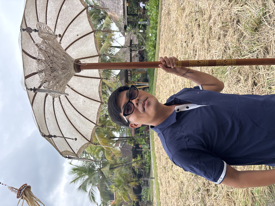 - "An adult male stands outdoors in Peliatan, Indonesia, holding a large, traditional Balinese ceremonial umbrella" by FM-kVMXo2, licensed under CC BY 4.0