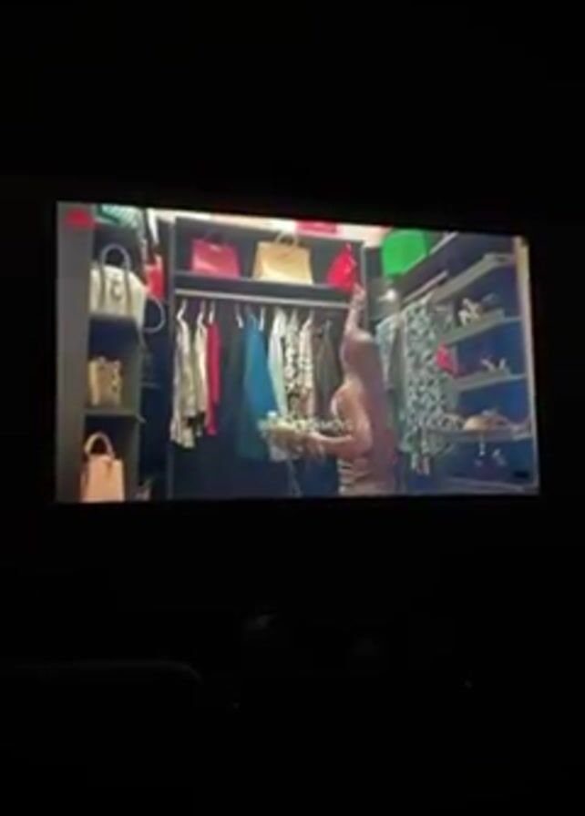A video shows a woman standing in her closet. She is wearing a striped, form-fitting dress. Her closet has multiple shelves containing handbags and shoes. There is also a hanging rack full of clothes. The walls and shelves are dark. The video is dark as well, but the closet is brightly lit. At the bottom of the screen, a bit of a person is seen, sitting, presumably, watching the video. The bottom of the video has text, BIMBO ADEMOYE TV.