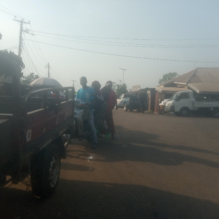A group of people stand near a motorized tricycle on a road. The tricycle has a red cargo area. The road surface is dark and appears to be asphalt or dirt. A few parked cars and trucks are visible in the background. A building with a corrugated roof sits on the right side of the image. Utility poles are present in the sky. The sky is overcast, creating a hazy or foggy atmosphere.
