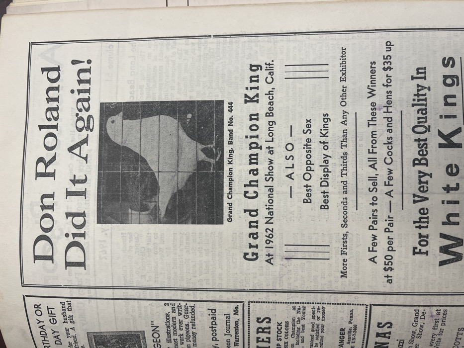 This image displays a photograph of an aged, off-white printed page from a periodical, likely a specialized journal or magazine, viewed at a slight angle. The dominant content is a large advertisement for "Don Roland" and his pigeons, occupying the majority of the right column. The advertisement features a black-and-white halftone photograph of a plump, white King pigeon, labeled "Grand Champion King, Band No. 444," facing right within a dark rectangular frame. The pigeon appears to be standing on a gridded surface, possibly the bottom of a cage. The headline above the image reads, "Don Roland Did It Again!" Text below the pigeon's photo indicates it was "Grand Champion King At 1962 National Show at Long Beach, Calif." Further text lists additional achievements: "Best Opposite Sex," "Best Display of Kings," and "More Firsts, Seconds and Thirds Than Any Other Exhibitor." The advertisement also states, "A Few Pairs to Sell, All From These Winners at $50 per Pair — A Few Cocks and Hens for $35 up," concluding with "For the Very Best Quality In White Kings" (partially visible). The left column of the page contains fragments of other advertisements or articles, also related to pigeons. Visible text includes "PIGEON" and "on Journal Warrenton, Mo.," suggesting the publication originates from Warrenton, Missouri. Another partial advertisement mentions "Annville, Penna." There is no information within the image indicating a location in Oklahoma City, United States. The overall environment depicted is a flat, two-dimensional printed page, characterized by typical paper aging and minor handling wear. No specific individuals are visible, but Don Roland is identified as the breeder and seller. The content is an advertisement for the sale of championship-winning show pigeons.