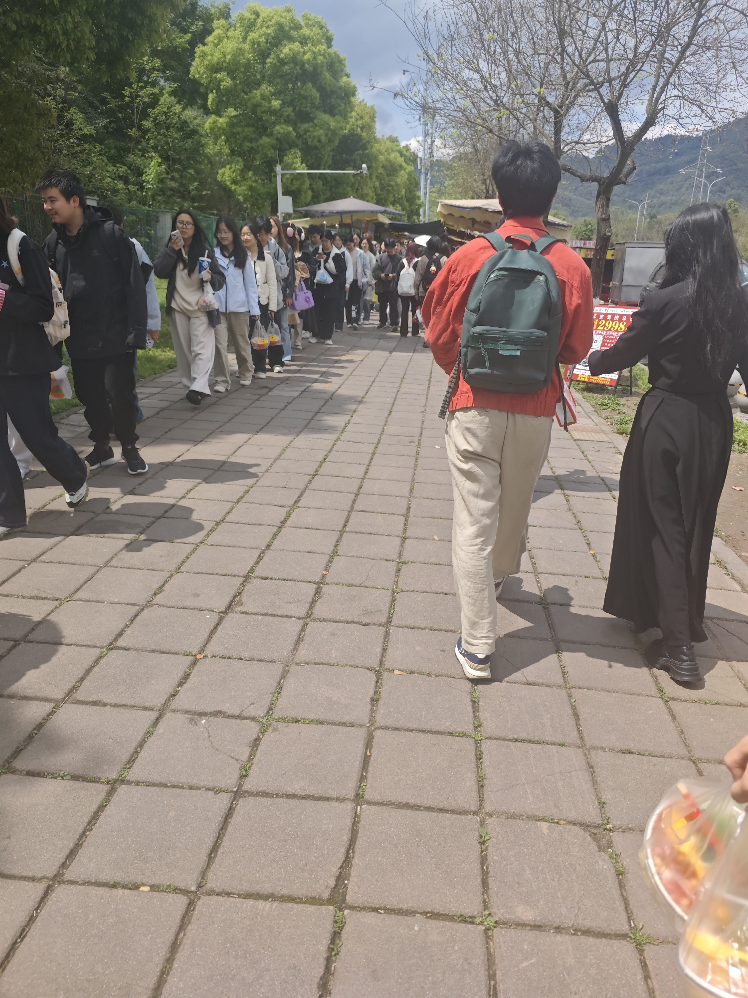A medium shot captures a paved walkway in what appears to be an outdoor area. A long line of people stretches into the distance, waiting for something out of the frame. The foreground features a person walking away from the camera, wearing a red shirt, light-colored pants, a dark green backpack, and blue sneakers. Beside them is another person in a black top and long black skirt. The pavement is made of large, square paving stones, with small patches of grass growing in the cracks. The area is lined with trees. A partially visible sign and booth suggest a commercial or recreational zone. The blurred image in the lower right corner shows a person holding a plastic bag, possibly containing food. The presence of multiple people lining up and the signs and structures visible in the background suggest this location is in the city of Shapingba District, China.
