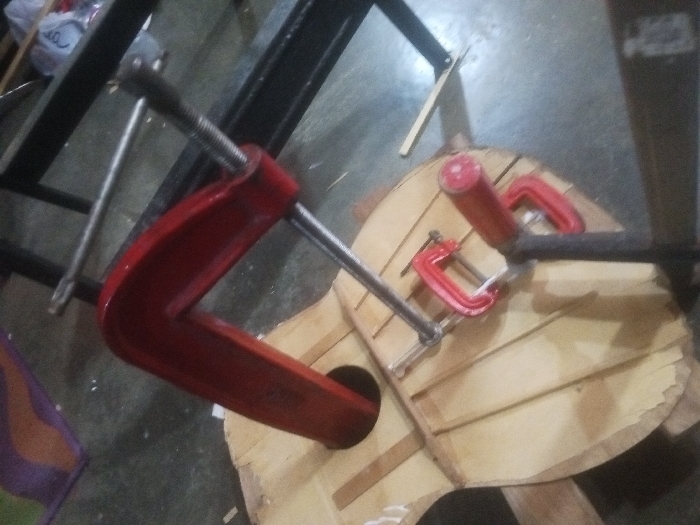 A disassembled wooden guitar or similar instrument is being reassembled. Several red metal clamps are employed to hold the pieces together. A large C-clamp surrounds the body with one end going through the soundhole. Two smaller clamps are on the top-right, appearing to hold a section of the top. The wood is light in color and appears to be in the process of being glued together. A work table is visible in the background.