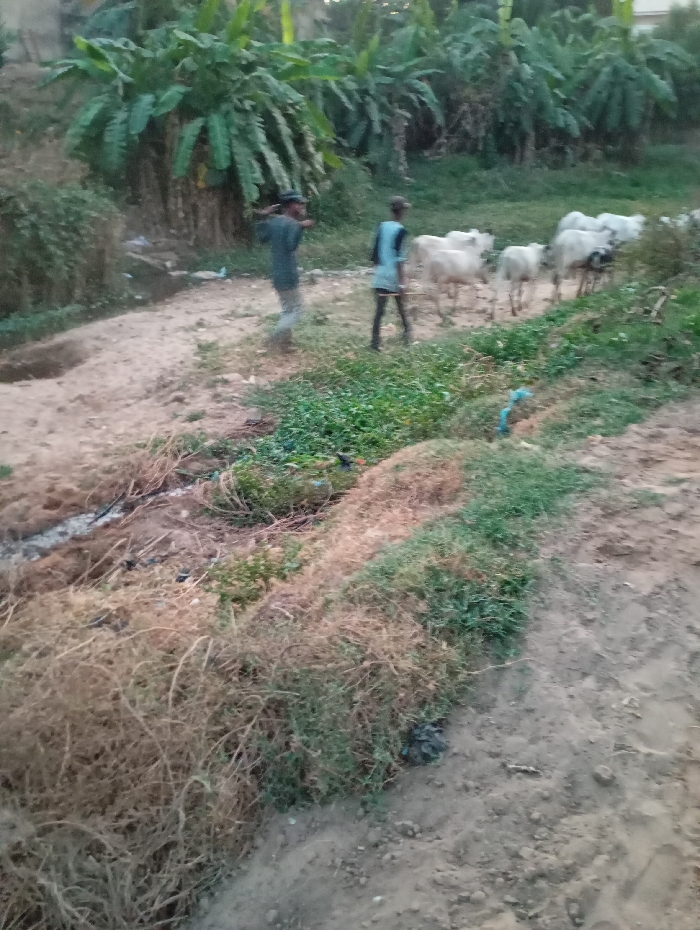 Two people herd a group of white cows across a dry, grassy field. The person in front carries something on their shoulder, while the second person walks beside the cows. Lush green trees and vegetation line the background, contrasting with the dry, brown landscape. A small stream or ditch runs alongside the path, indicating a potential water source in the area. The scene appears to capture a rural, agricultural setting.