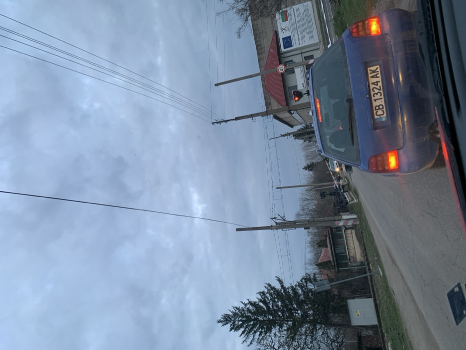 The image depicts a static scene from a vehicle's perspective, looking forward on a road in Gromshin, Bulgaria, under an overcast sky. A blue hatchback vehicle, identified by Bulgarian license plate CB 1324 AK, is stopped directly in front of the observer, with its brake lights illuminated. This vehicle is situated at a railway crossing, where a red traffic signal light is actively illuminated for road vehicles. Beyond the blue car, at least two additional vehicles are visible, also stopped in traffic with their headlights on. To the left of the road, railway tracks run horizontally across the scene, alongside a small, light-colored hut or control booth. A tall, dark green coniferous tree stands prominently on the far left. Utility poles and a network of overhead wires are numerous throughout the midground. On the right side of the road, a two-story building with a distinctive red-tiled roof is visible. Adjacent to this building, a large white information board displays the European Union flag and the Bulgarian flag, along with text. A red circular sign marked "4T" is positioned near this board. Sparse, bare deciduous trees and other buildings with red roofs are scattered across the background. No individuals are explicitly visible.