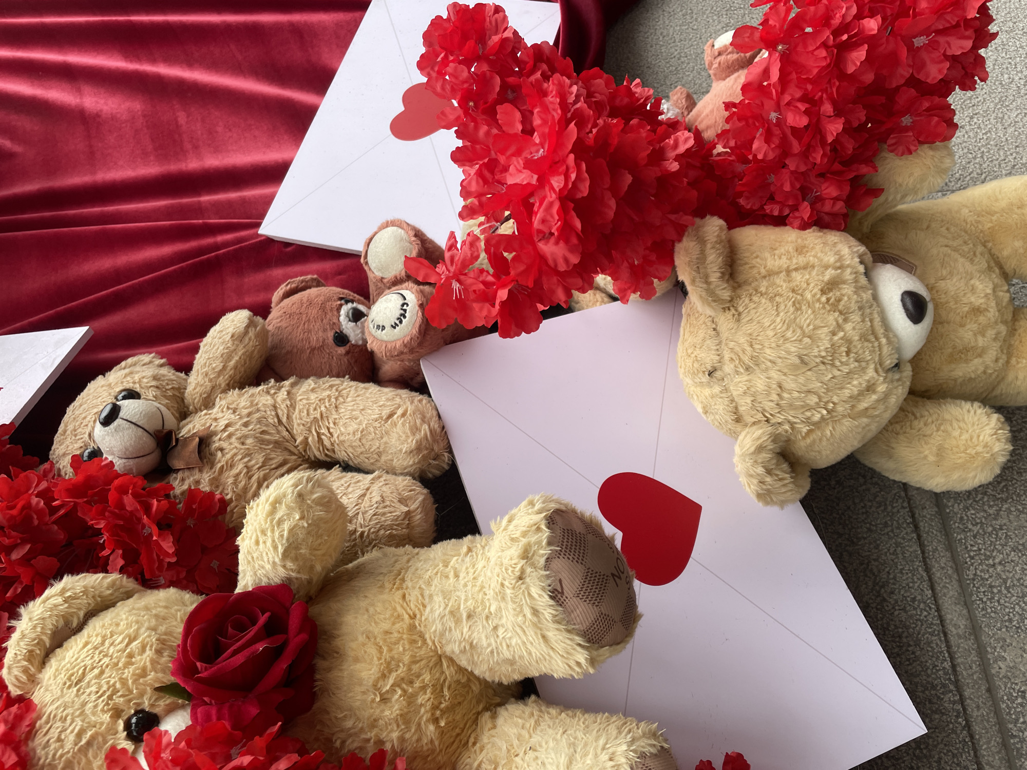 A ground-level decorative display is depicted outdoors in Yerevan, Armenia. The scene features multiple plush teddy bears, oversized white envelopes, and red artificial floral arrangements. Five distinct teddy bears are visible: two large tan bears, one positioned in the upper left holding a single red rose, and another to its right wearing a small bell around its neck; a medium-sized reddish-brown bear in the middle-right featuring "dream" text on one footpad; and a large tan bear lying face-down in the lower center, displaying patterned footpads, alongside another partially obscured medium bear. Several large white envelopes, each marked with a red heart decal, serve as platforms and backdrops for the bears. Extensive clusters of small red artificial flowers are arranged throughout, with a prominent heart-shaped floral arrangement in the lower-right foreground. A draped red velvet-like fabric provides a background element on the right side. The display rests on a grey, textured ground surface.
