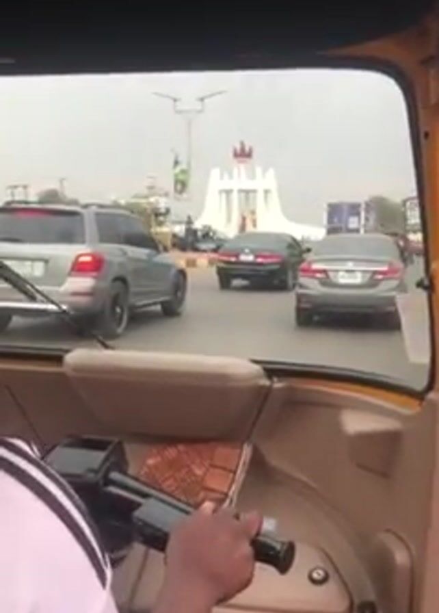 perspective from inside a yellow auto rickshaw as it navigates through city traffic. The driver, a man wearing a white shirt with black stripes, is seen operating the vehicle. The road is busy with various cars, including a gray Mercedes SUV, a black BMW, and a gray Honda sedan. In the background, there is a white architectural structure topped with a red crown. The rickshaw stops at an intersection, with a view of buildings and billboards in the distance.