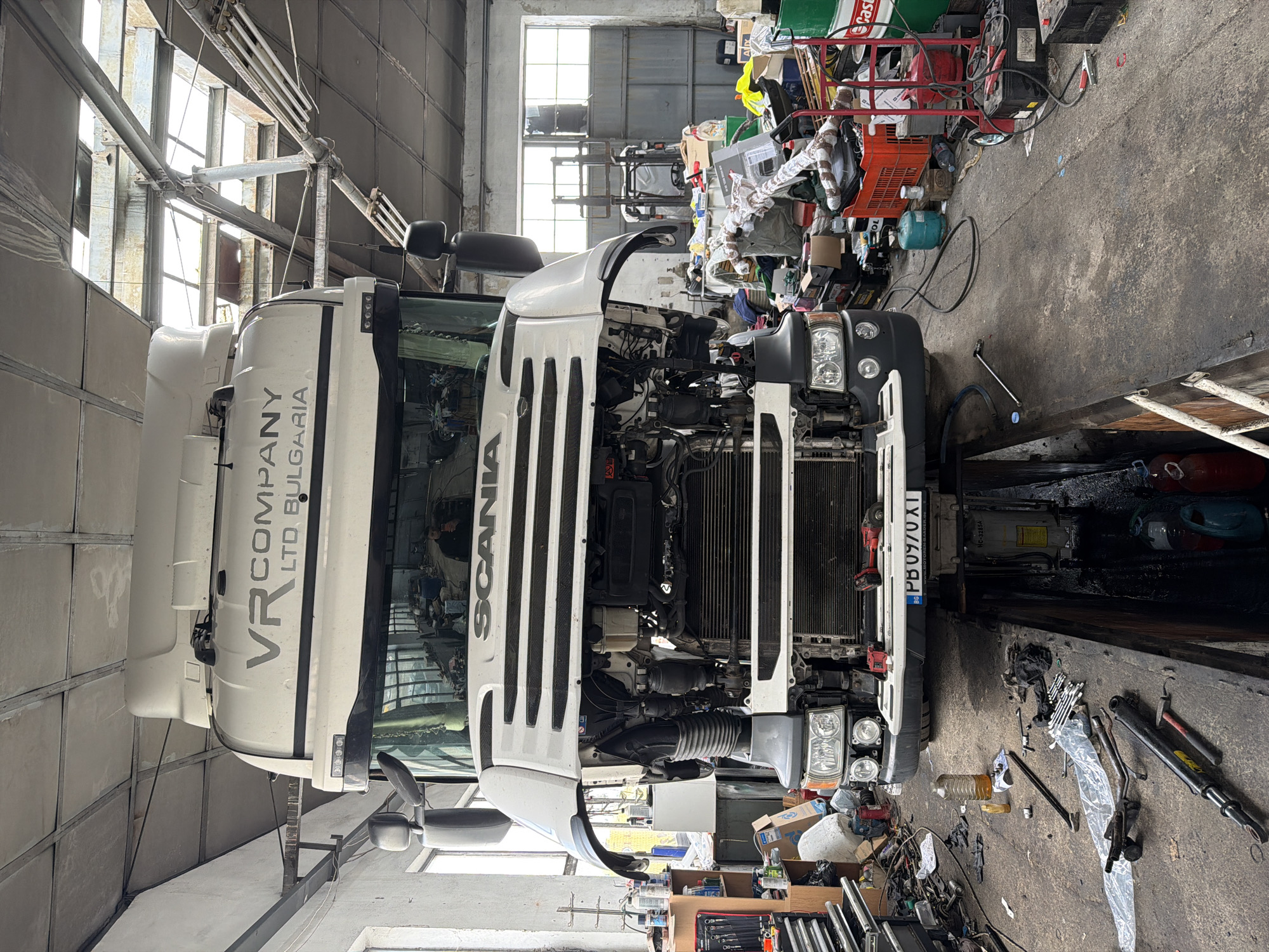 This image captures the interior of a commercial vehicle repair garage in Chirpan, Plovdiv Province, Bulgaria. A white Scania semi-truck, featuring "VR COMPANY LTD BULGARIA" stenciled on its cab and a Bulgarian license plate "PB 0970 XT", occupies the central foreground, positioned over a service pit. The truck's front grille, hood, and portions of the bumper are detached, revealing the radiator, intercooler, and various engine bay components. The concrete floor surrounding the vehicle is heavily stained with oil and debris. Tools, including an assortment of wrenches, a hammer, a pneumatic drill, and a hydraulic cylinder, are scattered on the floor directly in front of the truck. A clear plastic bottle containing a yellow liquid and loose plastic sheeting are also present. To the left, a multi-drawer metallic tool chest is visible, along with other work-related clutter and equipment. The right side of the garage floor is densely packed with miscellaneous items: cardboard boxes, red and black plastic crates, two blue gas cylinders, a red hand truck, multiple car batteries, charging cables, and large barrels, one bearing a "Castrol" logo. The background features large windows, through which a section of the facility with a forklift is discernable. The ceiling consists of a metal framework with several skylights providing natural light. A male individual, wearing a dark jacket, is visible as a reflection in the truck's windshield, facing the viewer. No direct interaction is observed.