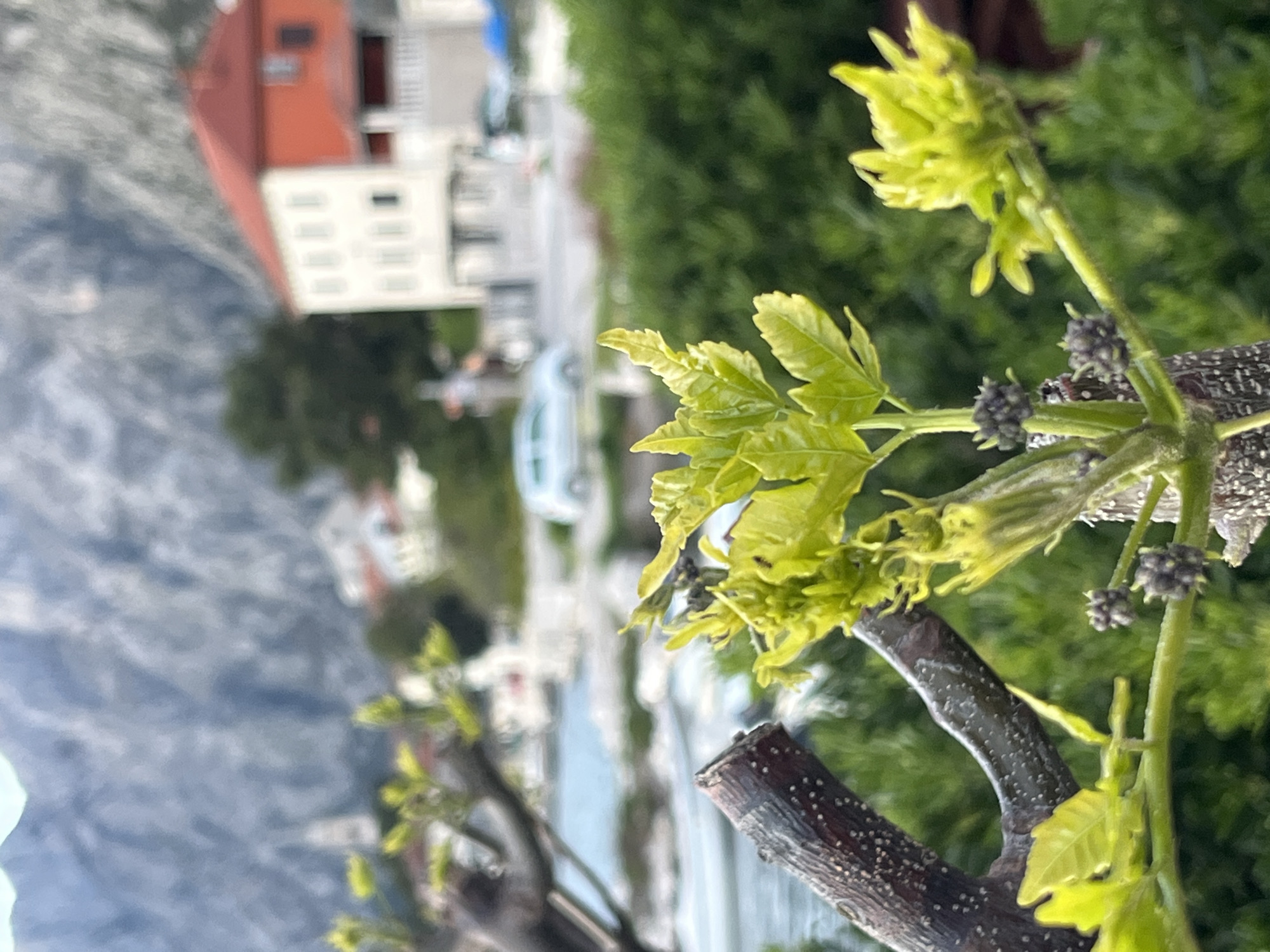 close-up of a vine with new leaves and small grape buds emerging, obscuring a distant view of Dobrota, Montenegro. In the background, there are buildings with red-tiled roofs and light-colored walls, typical of the region. A blurred car is visible on a road, and behind it is the water. Further in the distance are the mountains of the Bay of Kotor. The foreground is dominated by the texture of the vine's bark and the vibrant green of the fresh leaves and budding fruit. The image is taken at eye-level, looking outwards from the vine towards the distant cityscape. The location is Dobrota, Montenegro.
