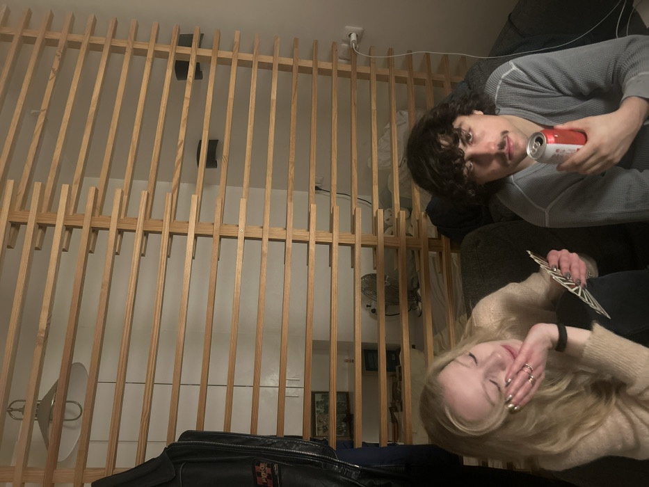 Two individuals are in a room with wooden slat walls. One person, with dark curly hair and a mustache, holds a red and white can. The other person, blonde, is holding a deck of cards, wearing rings. A black leather jacket lies in the foreground. A fan and framed artwork appear in the background. The room is illuminated with warm light.