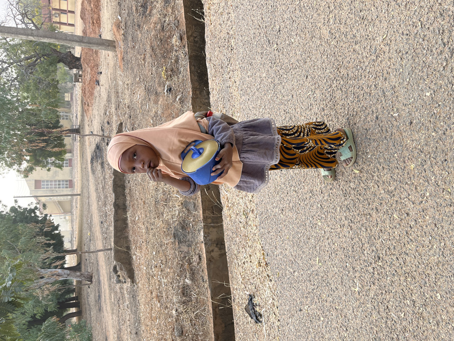 A young girl in a peach hijab, a grey dress with ruffled edges, and patterned pants stands on a paved surface. She holds a blue and yellow container with handles. She gazes at the camera while putting a finger in her mouth. The background consists of dry vegetation, a concrete ditch, and a building with white-framed windows in the distance. A partially visible tree stands to the left of the frame.