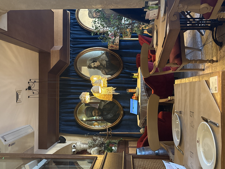 The image depicts the interior of a restaurant identified as Katyusha, located in Kyiv, Ukraine. The scene is observed from a seated position at a dining table. In the mid-ground, a round table with a white, fringed tablecloth is positioned against a wall draped with deep blue velvet curtains. A silver laptop with an active blue screen is open on this table. Adjacent to the laptop are a stack of colorful items, an orange fruit, and several small bottles (possibly condiments). Surrounding the round table are multiple red velvet armchair-style chairs with dark wooden legs. The blue curtains serve as a backdrop for three large, oval-framed portraits. The left portrait features a man in a turban and traditional attire. The central portrait displays a woman wearing a head covering. The rightmost portrait is partially obscured by green foliage, but also appears to depict a person in a head covering. Above the curtains, the upper wall is light beige with a brown decorative bulkhead. A white GREE-branded air conditioning unit is mounted on the upper left wall, and a square ventilation grate is visible in the ceiling. Hanging above the round table is a multi-bulb chandelier with five woven, light-colored pendant shades. To the far left, a wooden partition with a rattan panel and a decorative wall fixture resembling two white "eyes" are visible, alongside some artificial floral arrangements. In the foreground, a wooden dining table is set with two white plates, silver cutlery (knives visible), and brown paper placemats. One placemat displays a QR code. A cream-colored wooden chair with a red upholstered seat is positioned to the right of this table. No people are visible within the frame.