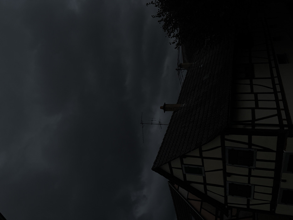 The image depicts a half-timbered house in Brumath, France, under an extremely dark, overcast sky. The sky occupies the upper two-thirds of the frame, filled with heavy, uniform dark grey to black clouds, suggesting impending weather or deep twilight. The house, positioned in the lower left and central-right, features light-colored walls with dark exposed timber framing forming a grid pattern. Its steeply pitched roof is covered with dark reddish-brown tiles. A brick chimney and a Yagi-Uda television antenna are visible on the roof. Multiple windows, some with dark shutters, are present on the visible facade. A second building with a similar roofline is partially visible to the left. Dark, dense foliage, likely trees, is present on the far right, obscuring a portion of the background. The scene is underexposed, resulting in deep shadows and an overall somber appearance. No people are visible.