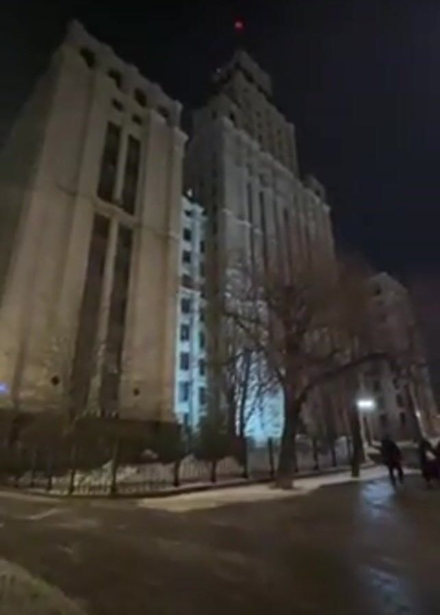 The video presents a low-angle view of a tall, imposing building at night. The structure appears to be made of light-colored stone or concrete, and is illuminated by artificial light. It features a complex architectural design with multiple levels and vertical columns or lines emphasizing its height. At the very top, there is a red light. The building is situated on a city street with a sidewalk partially covered in snow or ice. A dark metal fence runs along the edge of the sidewalk, separating it from the building's grounds. Several people can be seen walking in the distance. The sky is dark, and bare trees stand in the foreground, partially obscuring the view of the building. The overall impression is of a cold, urban environment, highlighting the grandeur and scale of the building against the night sky.