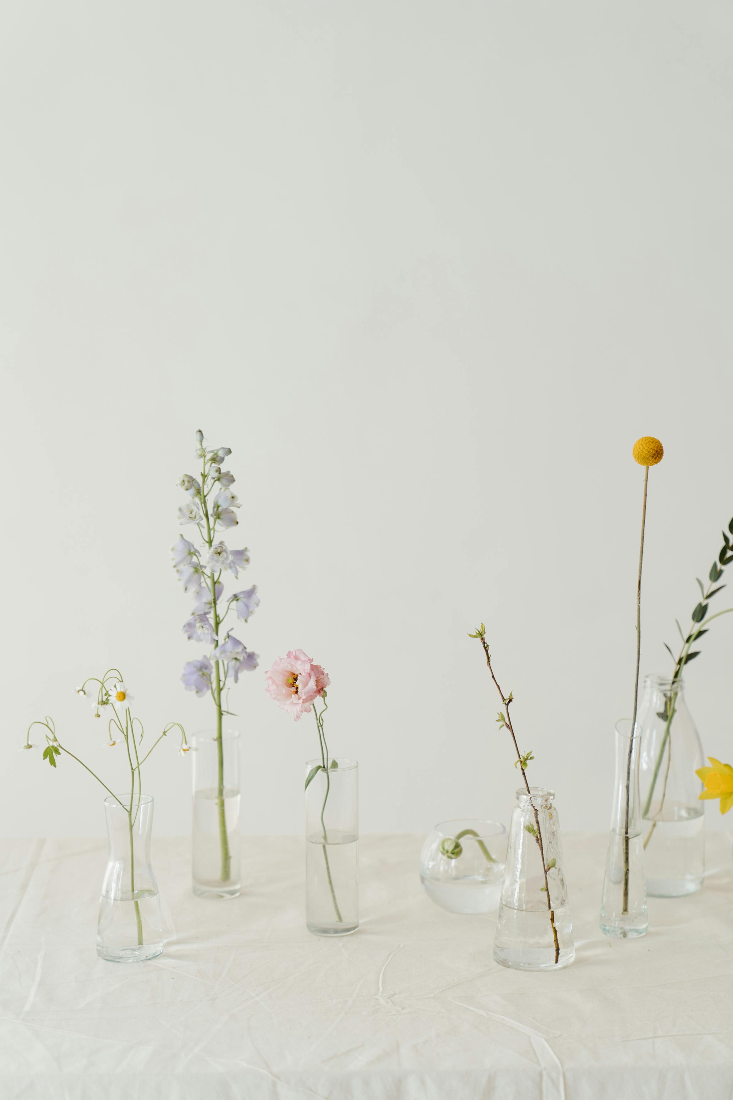 table covered in a white tablecloth with a variety of flowers in glass vases. The flowers include purple delphiniums, a pink eustoma, white daisies, and yellow billy balls. The background is a white wall. The scene is located at the coordinates 16.068500518798828, 108.22149658203125 which is in Da Nang, Vietnam. The flowers are arranged in a row, with the tallest vase in the center and the shortest vases at the ends. The flowers are all in bloom and appear to be fresh. There are no people in the image.
