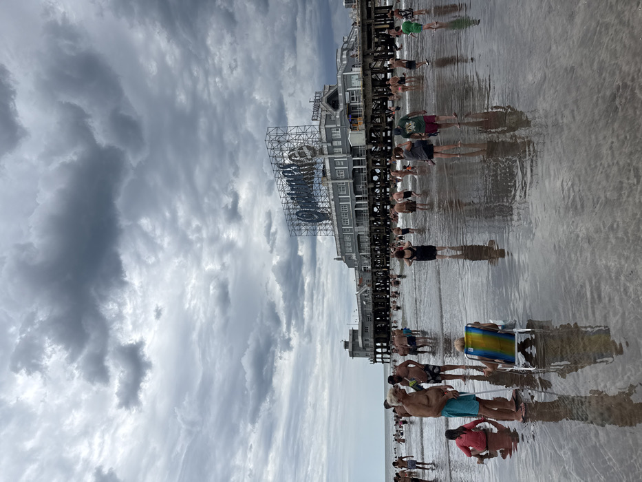 A beach scene features a pier extending into the water. People are walking along the wet sand near the pier, and some are standing in the shallow water. The sky is filled with dark, ominous clouds. A large sign, possibly the pier's name, is visible on the structure. The overall impression is a busy beach day with approaching inclement weather.