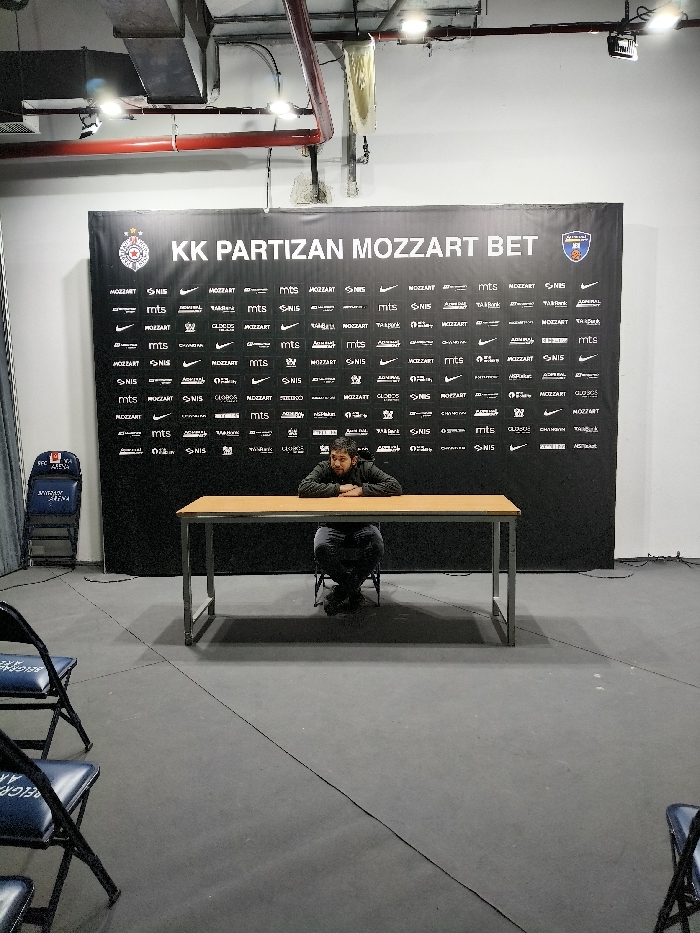A man is seated at a wooden table against a backdrop featuring "KK PARTIZAN MOZZART BET" with a logo on each side