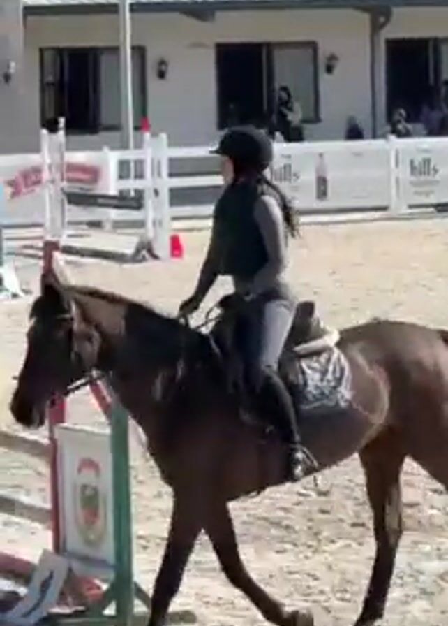 three people horseback riding in an outdoor ring with sand footing. The first rider is a woman wearing a helmet, vest, gray pants, and black boots. Her horse is brown. Another rider, wearing a helmet and striped shirt is on a black horse. The third rider is wearing a helmet, a white shirt, and light colored pants. They are riding in the background on a brown horse. There are several jump obstacles in the ring and a building with a white fence and a sign behind it. The day is sunny.