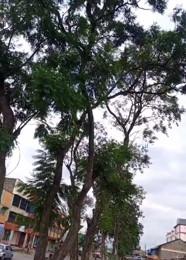 street scene with trees lining the sidewalk. There are buildings on both sides of the street, and a car is parked on the left side. The sky is cloudy, and the overall lighting is somewhat muted. The camera is static and the scene is generally quiet.