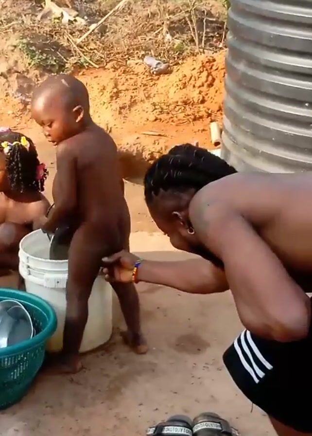 two young children, a boy and a girl, washing dishes outdoors. They are both naked and standing or squatting near a green basket filled with metal utensils and a white bucket. The girl is sitting, holding a plate, and smiling. The boy is standing, initially being playfully touched on the rear by a shirtless man with braided hair and Adidas shorts. The man moves away, and the boy briefly gestures with his hand before striking a pose. In the background, there is a dirt ground, some vegetation, and a water tank.