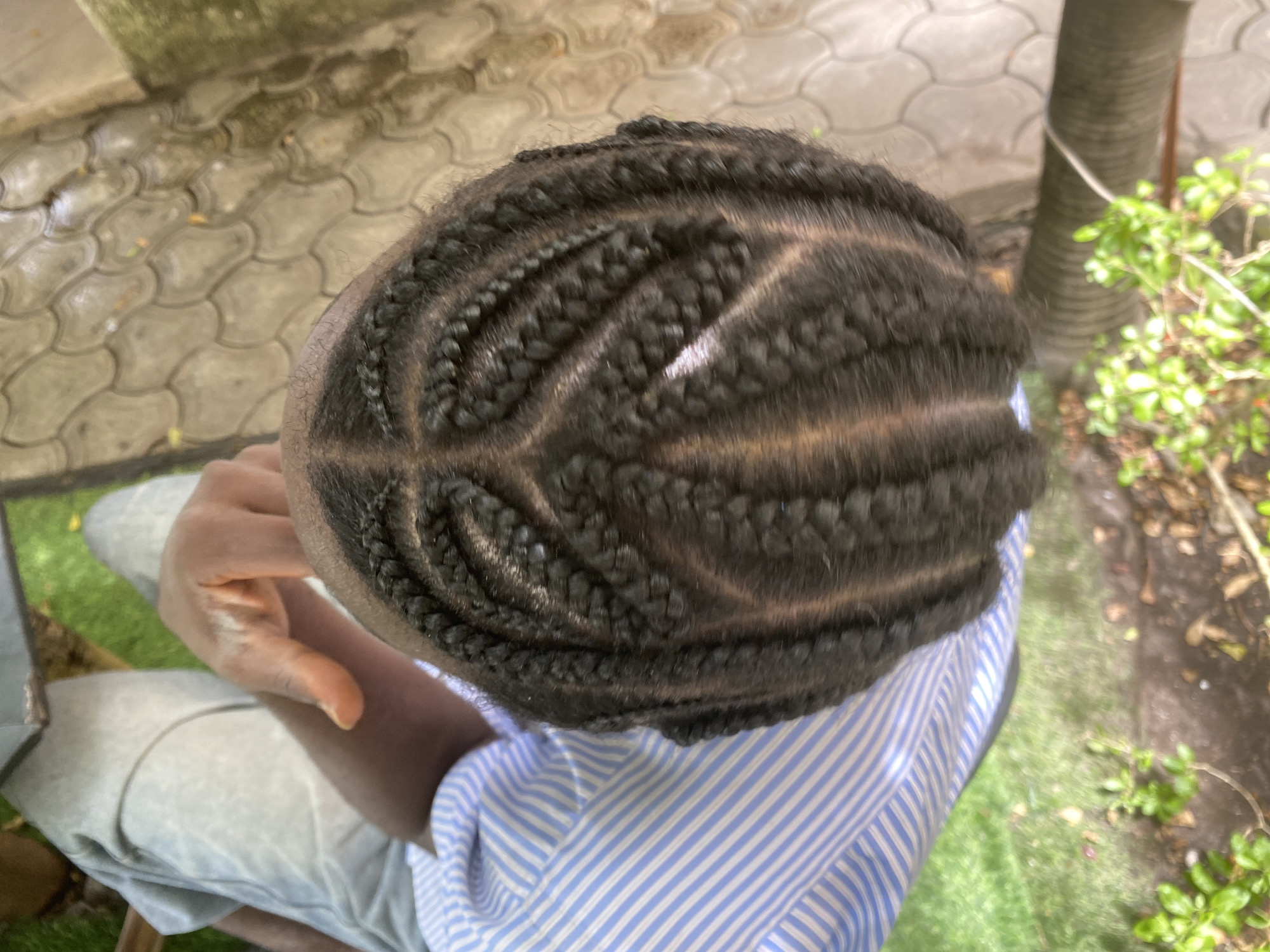 Overhead shot of a person with tightly braided black hair in Alagba, Nigeria. The hair is styled in rows, with sections braided inward and then out in a curved pattern. The person is wearing a blue and white striped shirt and light-colored pants. A hand is visible, partly obscuring the view. The background includes a paved area, greenery, a tree trunk, and a patch of grass. The scene appears to be outdoors in a partially shaded area.