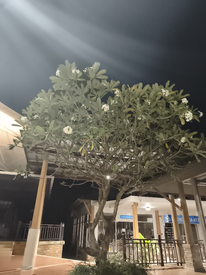 A flowering tree dominates the frame at night. White flowers are interspersed amongst large green leaves. The tree's trunk has a dark, gnarled appearance. It is surrounded by a small patch of greenery at its base. A building is visible in the background with a covered porch area. Railings and supporting columns are part of the architectural details. The sky above is dark and clear, adding to the nighttime ambiance.