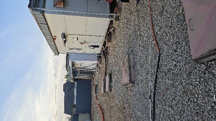 The image displays an outdoor utility or telecommunications site located in Kabala, Nigeria. The ground surface is covered with light grey and brown gravel. Several cables and conduits, including orange, black, and grey varieties, are routed across the gravel. Four reddish-brown, rectangular access covers are visible embedded in the gravel, leading towards a row of structures. These structures are modular, pre-fabricated-style shelters, light-colored (off-white/light grey), with corrugated metal roofs, elevated on concrete bases. The closest shelter on the right features a white access door, a small window or vent, and an attached red device, possibly a fire extinguisher. Further along the row, other shelters and exposed equipment, potentially cooling units or electronic cabinets, are visible. In the background, a dark-colored building with a sloped roof is partially observed. The sky is light blue with sparse white clouds. No individuals are present in the scene.