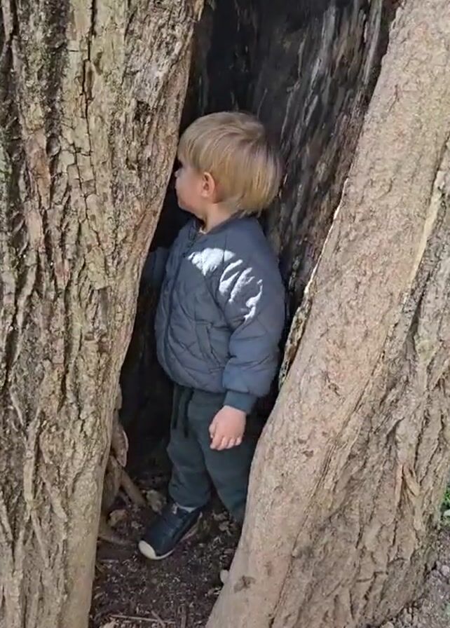 A toddler with blonde hair wearing a gray quilted jacket, dark green pants, and dark shoes is standing inside the split trunk of a large tree