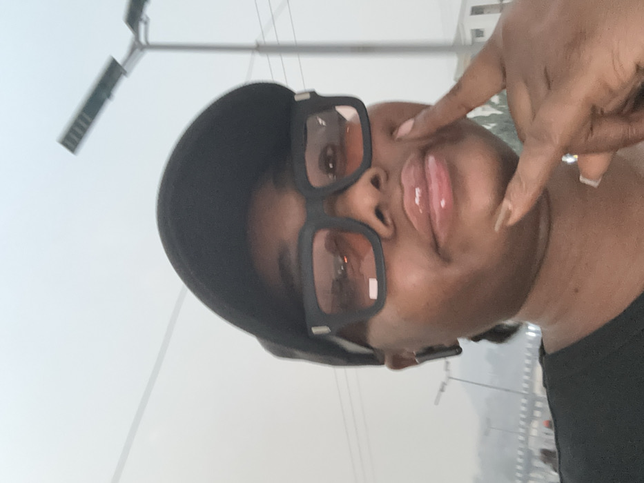 A person with dark skin wears black-framed glasses with orange lenses and a black cap. Their glossy lips are slightly parted. A finger points towards their cheek. The background is a bright, hazy outdoor scene, including a street lamp. The photo is taken from a low angle, making the sky and background appear bright and undefined.