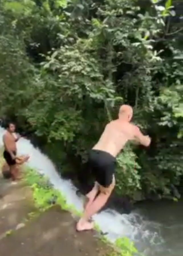 A shirtless man with a tattoo on his left arm jumps off a ledge into a waterfall-fed river. He's surrounded by lush green trees and vegetation. Several people are visible on the ledge before he jumps. The water is foamy where the waterfall enters the river. The man disappears under the surface briefly before resurfacing.