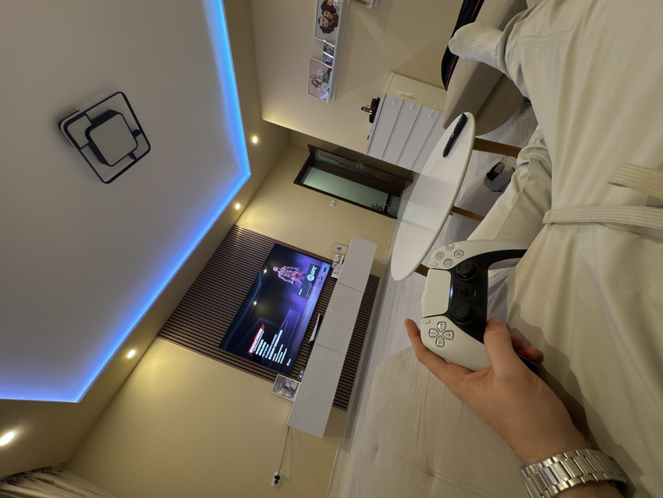 This image depicts a modern residential living space in the city of Radilovo, Bulgaria. The view is from a first-person perspective of an individual seated on a light-colored sofa, with their right hand holding a white PlayStation 5 DualSense controller, which displays an illuminated blue light bar. A silver-toned metal watch with a link bracelet is visible on the individual's left wrist. Their legs, clad in light-colored pants (possibly sweatpants with a visible drawstring) and white socks, are extended into the foreground. In the mid-ground, a white oval coffee table with light wooden legs holds a black remote control. Beyond the table, a large flat-screen television is mounted on a wall featuring vertical wooden slat paneling. The television displays a video game, identified as "UFC," showing a character model and menu options. Below the television, a white floating media console holds framed photographs and a PlayStation 5 console. The walls are painted a uniform light beige. The white ceiling incorporates recessed spotlights, a central black-framed square light fixture, and a perimeter blue LED strip light within a dropped ceiling section. To the right, a dark wooden door frame and open doorway lead into an adjacent room. Further to the right, a white chest of drawers is visible, with a white floating shelf above it displaying several framed photographs.