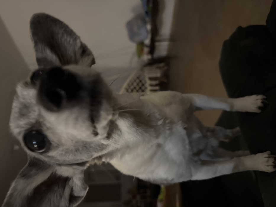 - "An indoor, close-up photograph depicts a small, short-haired dog, likely a Chihuahua, standing on a dark upholstered surface, possibly a sofa" by FM-Y9nKo2, licensed under CC BY 4.0