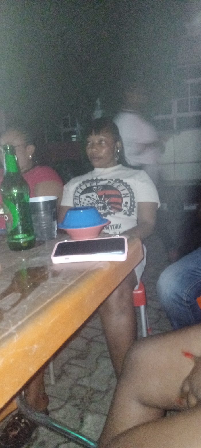 An outdoor gathering is visible with people sitting at a table. A green beer bottle, a cup, and a phone are on the table. A woman with bangs is wearing a "New York" shirt. The table is a light orange color, and one of the chairs is red. Some figures are blurred in the background. The image appears to be taken at night.