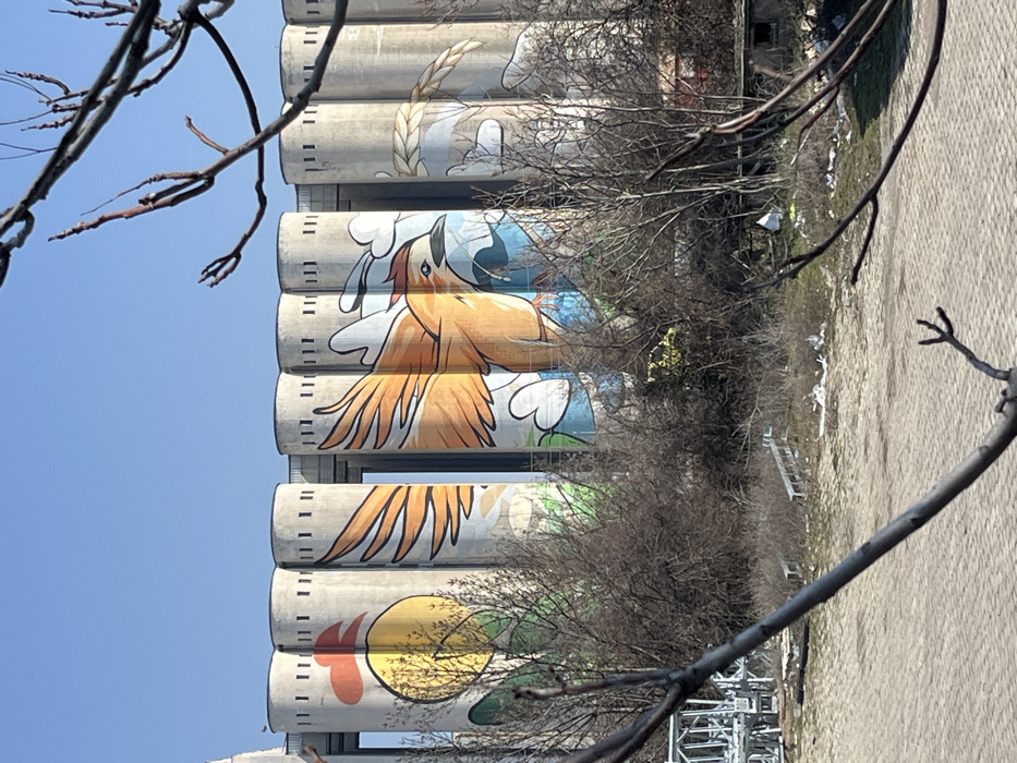 The image depicts a series of eight tall, cylindrical concrete grain silos, identified as the former "Granit" silos in Sofia, Bulgaria, under a clear blue sky. Each visible silo is adorned with a large-scale mural. From left to right: The leftmost visible silo features a stylized design incorporating a large yellow and orange circle, potentially representing a sun or a chicken's body, with red elements at the top and green below. The central silos collectively display a large, stylized bird with prominent orange wings and a reddish crest, depicted in flight against a blue background with white, cloud-like forms. The bird appears to hold a small, dark object, possibly a twig or seed, in its beak. The rightmost visible silo shows a portion of a stylized golden-yellow stalk of wheat or grain, also against a blue and white background. The immediate foreground consists of a paved, light-colored surface to the left. Beyond this, an unkempt strip of ground is visible, overgrown with dense, leafless deciduous trees and shrubs, indicative of late winter or early spring. Scattered debris, including white plastic refuse and metal structures, is present within this vegetated area. A thick, dark-barked bare tree branch extends diagonally from the lower right foreground, partially framing the view of the silos.