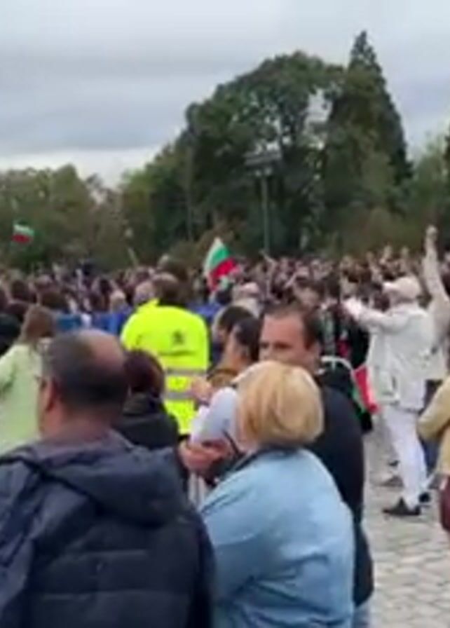 A large crowd of people is gathered in a public square. Many individuals are waving Bulgarian flags and clapping. The crowd is dense, with people of various ages and appearances. A man wearing a bright yellow vest is visible towards the front of the crowd. Buildings and trees are visible in the background. The sky is overcast.