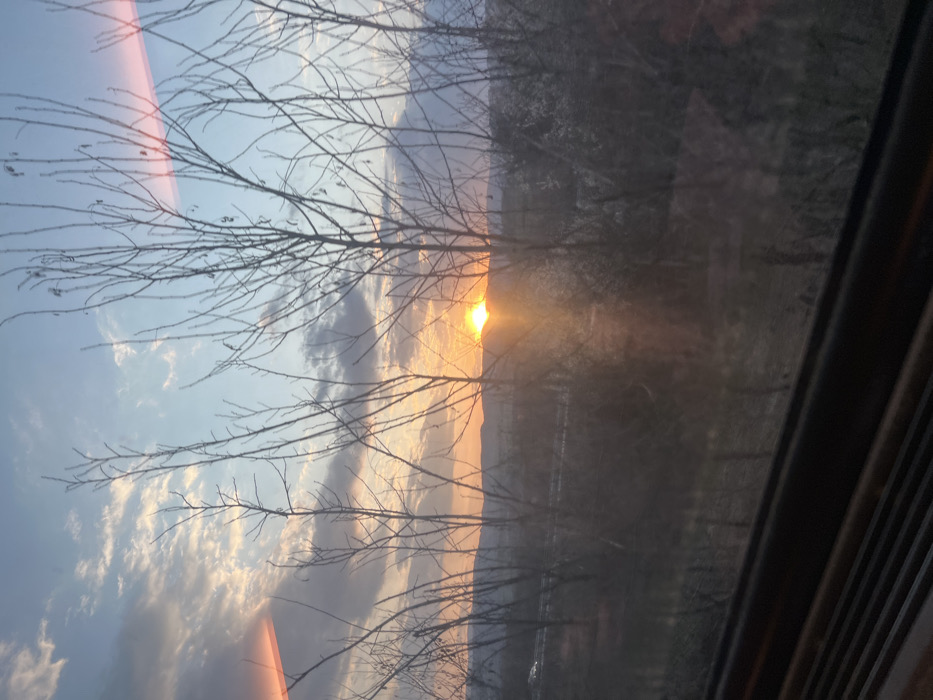 The image presents a landscape at sunset in Djerman, Bulgaria, viewed through a window. The sun, a bright yellow-orange orb, is positioned low on the horizon, emitting strong rays and a visible lens flare, appearing as a reddish-orange streak, in the upper portion of the frame. Numerous bare-branched trees, indicative of dormancy, occupy the foreground and mid-ground, silhouetted against the sky. Behind these trees, a road or highway is visible traversing horizontally, with a light-colored vehicle present on its left section. Distant hills or mountains form a dark silhouette along the horizon. The sky exhibits a gradient of colors including light blue, orange, pink, and grey with scattered clouds. The bottom of the image is occupied by a dark, horizontal structure consistent with a window frame or sill. No individuals are depicted.