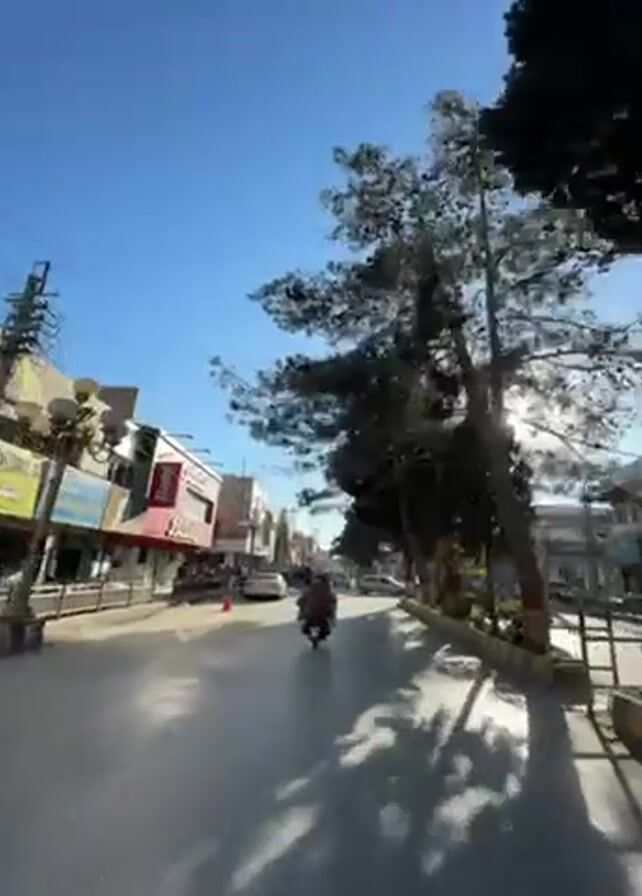 street scene on a sunny day. The camera appears to be mounted on a vehicle moving down a road lined with buildings on one side and trees on the other. Cars and a motorcycle are visible on the road. The buildings are a mix of colors and have various storefronts. The trees are tall and dense, with the sunlight filtering through the branches.