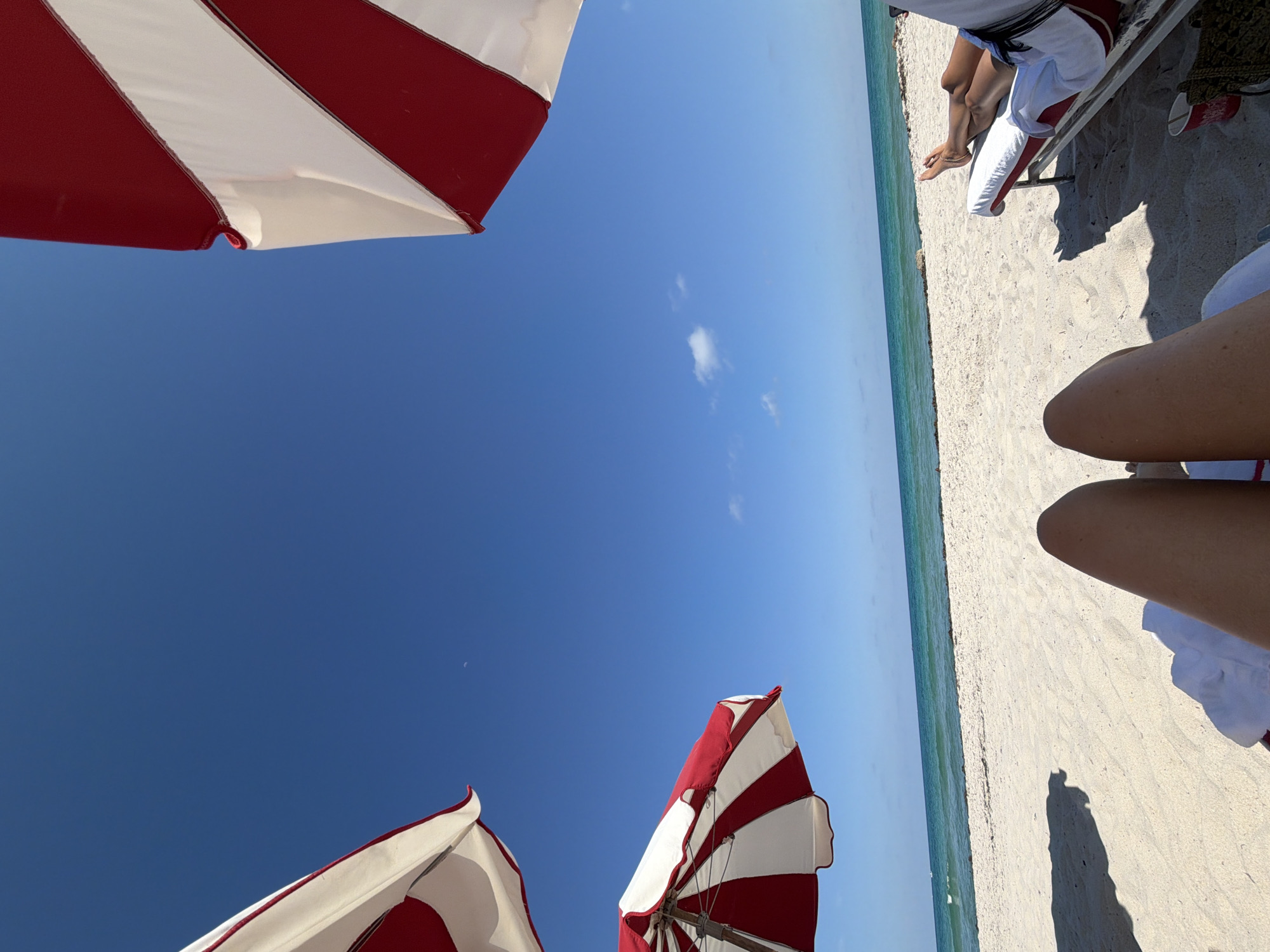 The image depicts a first-person view of a beach scene in Miami Beach, United States of America. In the immediate foreground, the bare lower legs of an individual are visible, resting on a white towel with a red stripe. To the right, another person's bare lower legs and feet are seen resting on a red and white striped beach lounge chair, with part of their white shorts and shirt visible. A red cup is positioned near this chair. The midground consists of an expanse of light-colored sand. Several red and white striped beach umbrellas are present, with two partially visible in the upper left and right, and another in the mid-left casting a shadow on the sand. The background features the turquoise ocean with gentle waves under a clear blue sky, containing a few scattered white clouds and a faint crescent moon in the upper center-left. The environment is bright and sunny.