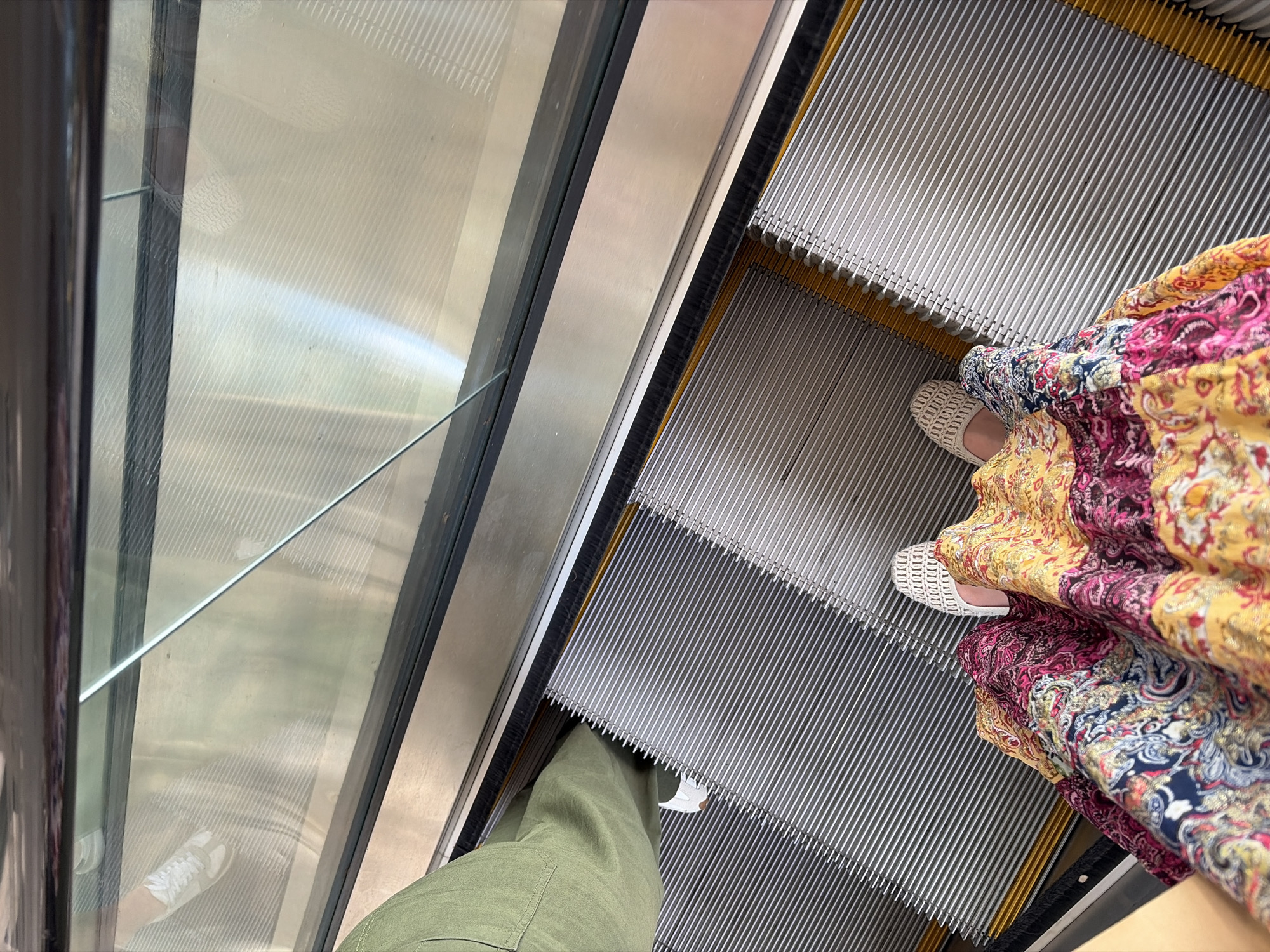 A high-angle shot shows two people riding an escalator. One person is wearing light green pants and a white shoe that is visible in the reflection on the glass wall. The other person is wearing a colorful dress and woven sandals. The setting appears to be an escalator within a building in the United States of America city of Coral Gables.