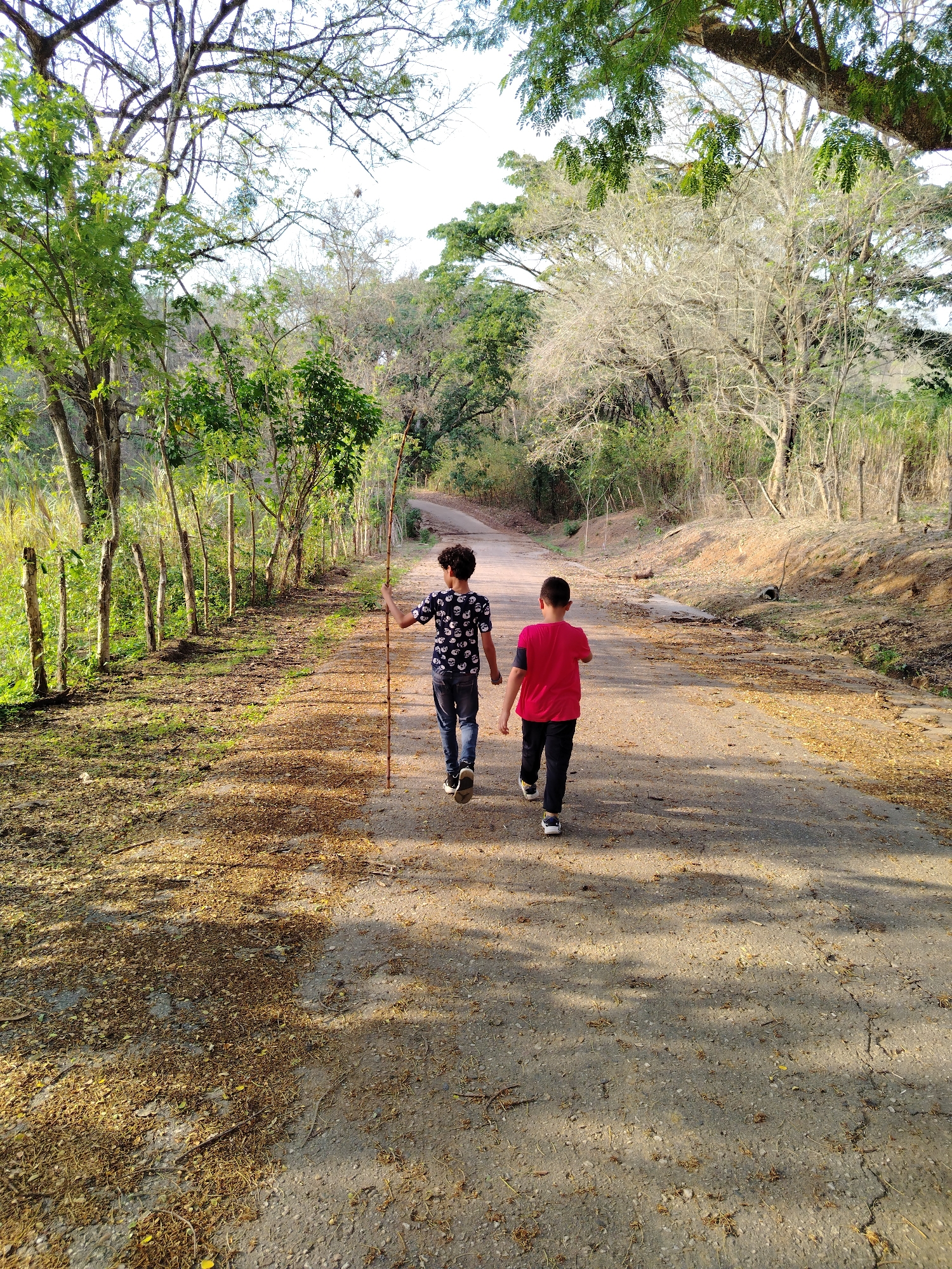 Two children are walking away from the viewer on a dirt road. The child on the left is carrying a long stick. The environment is a wooded area. There is a fence on the left side of the road. The location is likely Los Leoncitos, Venezuela, though there are no elements in the image to absolutely confirm this.