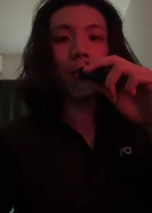 A young person with long dark hair is holding a black vape pen up to their mouth and exhaling. They are wearing a black shirt with a small white logo on the right breast. The room is dimly lit, with a red light illuminating the person's face. There is an air conditioner on the wall in the background. Music is playing in the background.