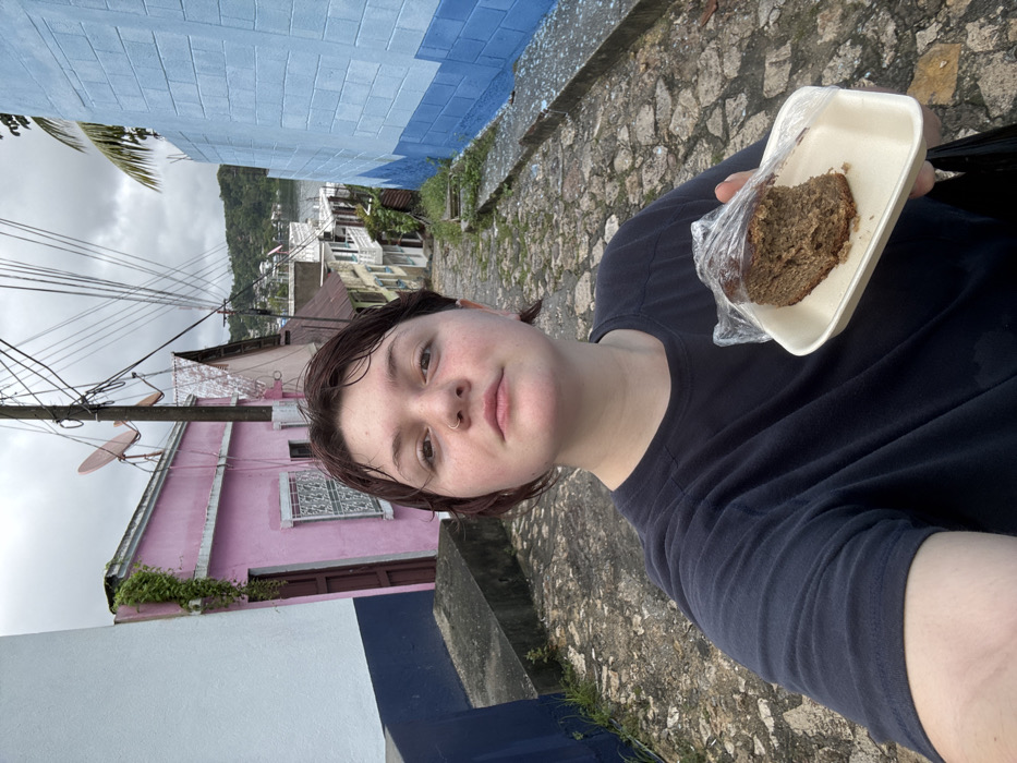 A single individual, appearing to be a young adult with short, dark hair and a nose ring, is depicted taking a selfie on a cobblestone street in Flores, Guatemala. The individual wears a dark t-shirt and holds a white foam container with a slice of partially-eaten baked good, wrapped in clear plastic. To the left, a multi-story pink building with a barred window and a brown door is visible, along with a white building segment. Utility poles with multiple black wires and two satellite dishes are overhead. To the right, a building wall painted in light blue and dark blue sections forms the edge of the street. The cobblestone street slopes downwards, revealing more colorful buildings and a body of water, likely Lake Petén Itzá, in the background, bordered by distant, vegetated hills. The sky is overcast.